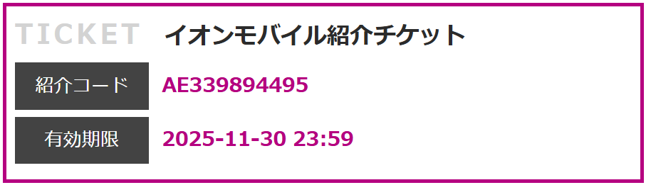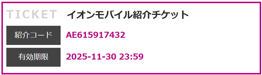 2025年11月時点で利用できるイオンモバイルの紹介トクキャンペーンの紹介コードは以下の通りです!